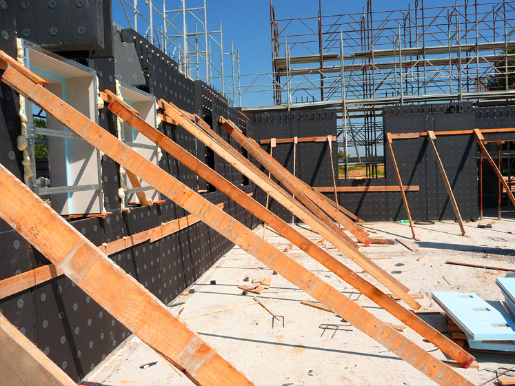I pannelli cassero di SOLAIO e di MURO sono stati poi movimentati anche manualmente (grande leggerezza dei casseri in EPS, polistirene espanso sinterizzato: da 6 a 8 il solaio e 22 Kg/m2 il muro) garantendo non solo velocità di posa e controllo dei costi ma soprattutto ampi margini di sicurezza in cantiere; infatti la direzione lavori e la direzione di cantiere non prescindono da un forte impegno su queste tematiche considerando la sicurezza in cantiere presupposto fondamentale nella scelta di tutti i materiali impiegati.
