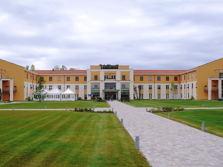 La residenza ha una superficie coperta di 3400 mq., ed è stata inserita nel lotto in modo da destinare gran parte dell'area a giardino, circa 17000 mq. sul fronte della struttura, evocando i grandi parchi che accompagnano gli ingressi delle ville venete.