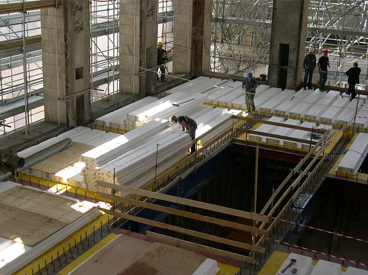 I pannelli cassero in EPS sono stati movimentati manualmente garantendo non solo velocità di posa e controllo dei costi ma soprattutto ampi margini di sicurezza in cantiere; infatti la direzione dei lavori e la direzione di cantiere non prescindono da un forte impegno su queste tematiche considerando la sicurezza in cantiere presupposto fondamentale nella scelta di tutti i materiali impiegati. La posa del solaio è semplice grazie alla sua leggerezza e alla versalità di posa, ed è estremamente adattabile a qualsiasi dimensione perché con poche e semplici operazioni si può tagliare a misura. Altra caratteristica determinante nella scelta di pannelli cassero in EPS per solai è la resistenza al fuoco degli elementi in opera che può essere certificata Rei 180".