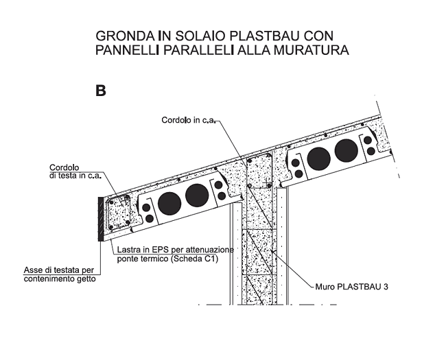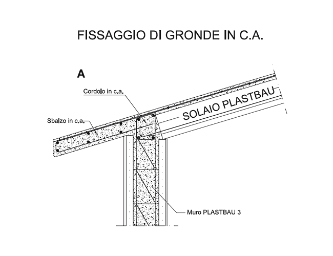 A) Particolari costruttivi muro Pb-3, tetto in flada con gronda in calcestruzzo gettato in opera